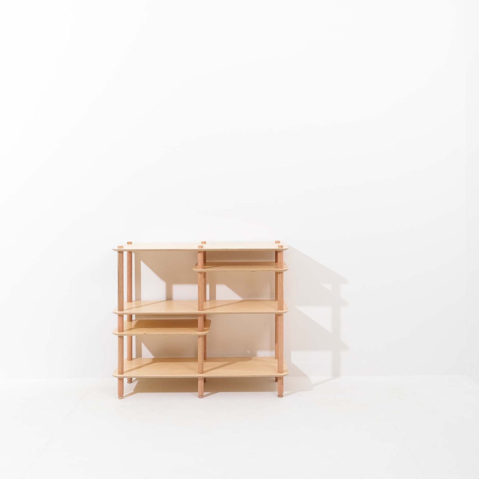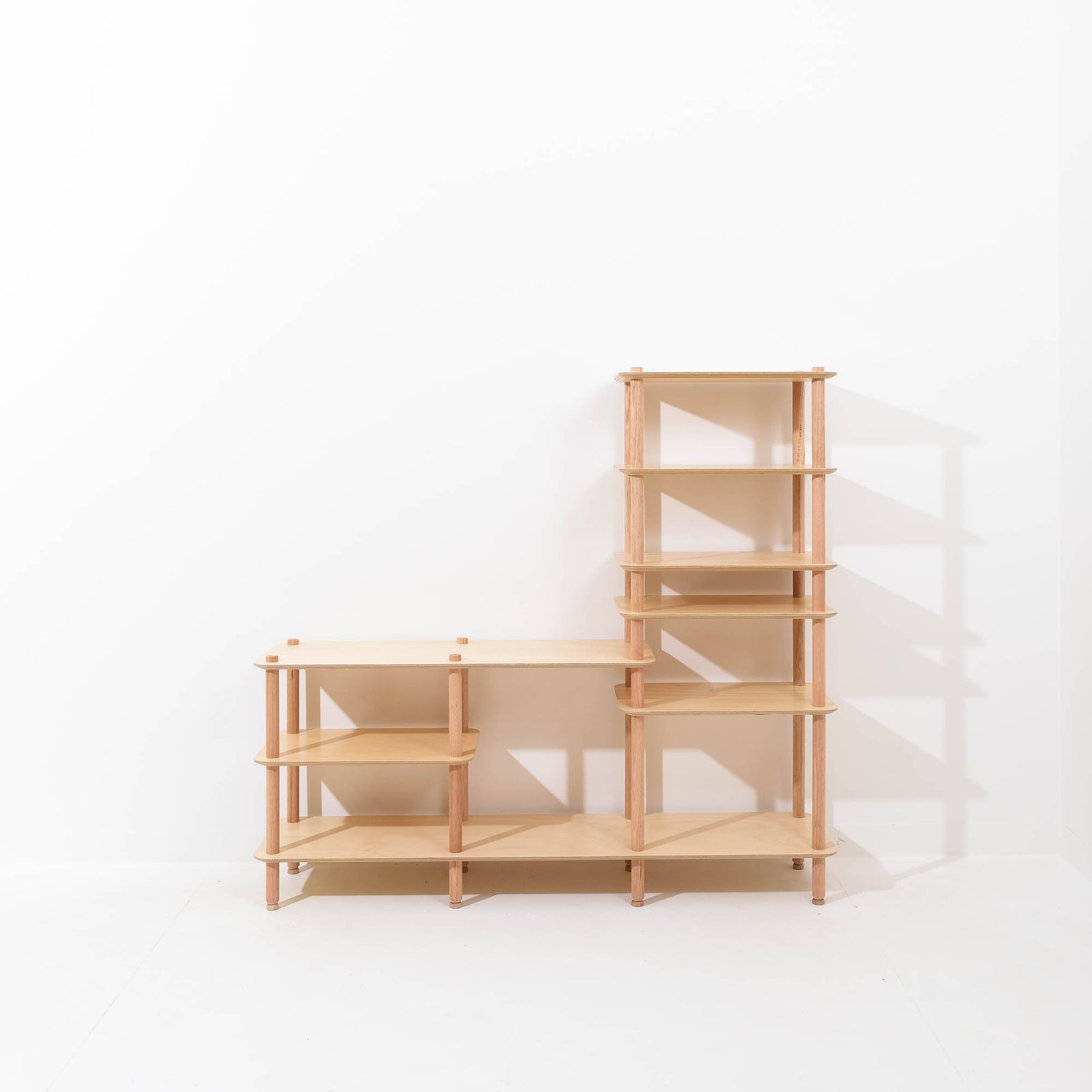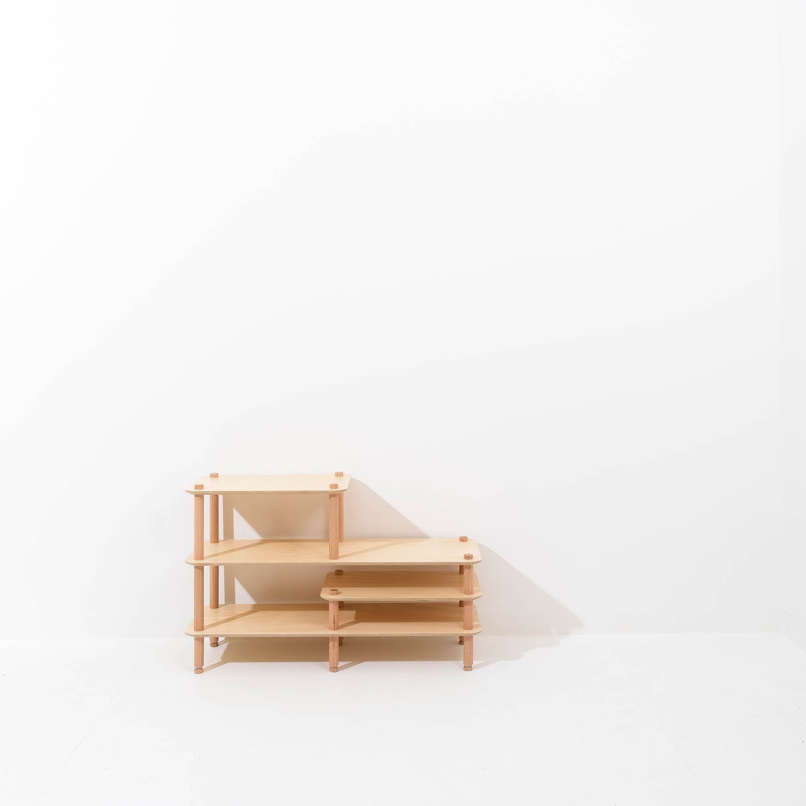 Depending on the set you choose, KittaParts ships with up to four sizes of threaded timber dowels and three shelf sizes, allowing you to quickly build numerous configurations and play with what works best for your space and the objects you wish to display.
